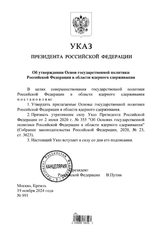 ▪️ Русия си запазва правото да използва ядрени оръжия в отговор на използването на оръжия за масово унищожение срещу нея или нейните съюзници;